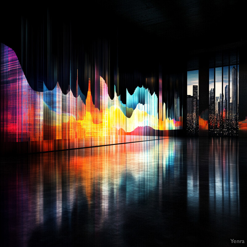 From Words to Waves 0 - Image Index | Yenra Vibrant Digital Oasis: A dimly lit room with vibrant digital art adorning the walls and ceiling. The artwork features abstract shapes that shimmer in shades of blue, orange, yellow, purple, pink, white, and black, creating an otherworldly ambiance reminiscent of a neon-lit cityscape at dusk or dawn. One wall is entirely dedicated to what appears to be a city skyline, where towering skyscrapers rise against the backdrop of the sky, their windows glowing with a soft light. The floor's glossy surface reflects the artwork, mirroring the colors and adding depth to the scene. This room seems to exist in its own bubble, cut off from the outside world and filled only with digital wonders.