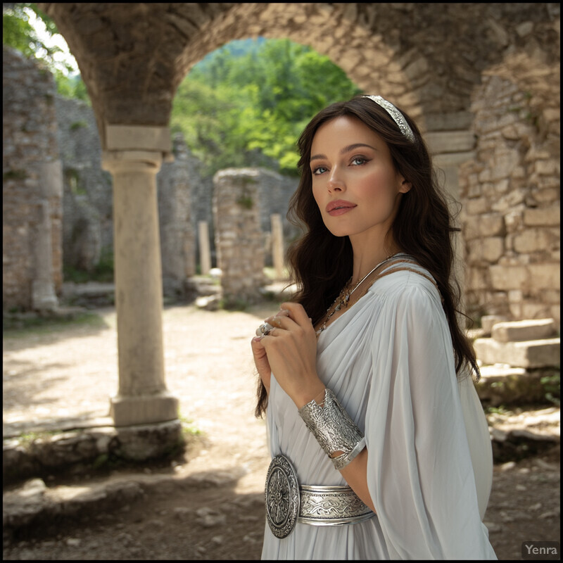 Rozafa Daughter 0 - Albania Image Index | Yenra Elegance and Antiquity: A Woman in Ancient Attire: A woman dressed in an ancient Greek or Roman-style white dress, standing in a stone structure with archways and columns. Her long dark hair is adorned with a silver headband, and her attire features intricate silver cuffs on her wrists and a large medallion around her waist. The woman's attire suggests that she may be playing the role of a goddess or queen from ancient mythology. She stands in an open-air courtyard, surrounded by stone walls and archways, which adds to the sense of grandeur and antiquity. The background is blurred, but it appears to be a natural setting with trees visible through the archways. Overall, the image conveys a sense of elegance, sophistication, and historical grandeur.