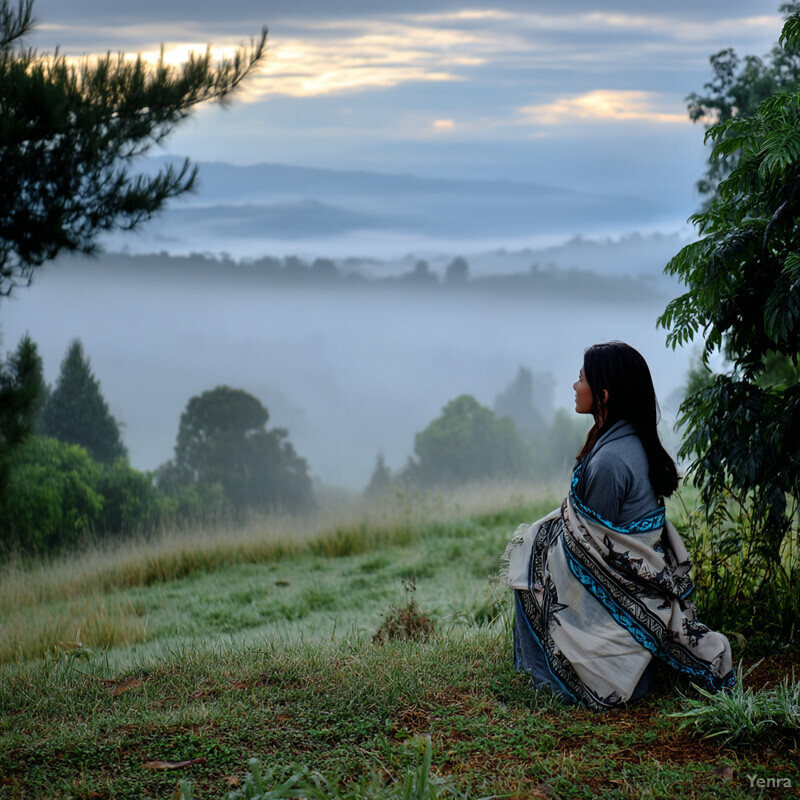Mountain Mist 3 - Cambodia Image Index | Yenra Serenity in the Field: The photograph captures a woman standing in a lush green field at sunset. She wears dark blue jeans and a light purple long-sleeved shirt, adorned with a vibrant purple scarf featuring white polka dots and red stripes on the ends. A pair of sunglasses rests atop her head, adding a touch of elegance to her outfit. The field itself is characterized by its verdant green grass, dotted with small clusters of yellow flowers that add a pop of color. In the distance, a line of trees meets the horizon, their silhouettes softened by the warm glow of the setting sun. Beyond the treeline, a brilliant orange and pink sky stretches across the landscape, punctuated by a few wispy clouds drifting lazily through the air. The overall effect is one of serenity and tranquility, as if nature itself has been set aflame with color.
