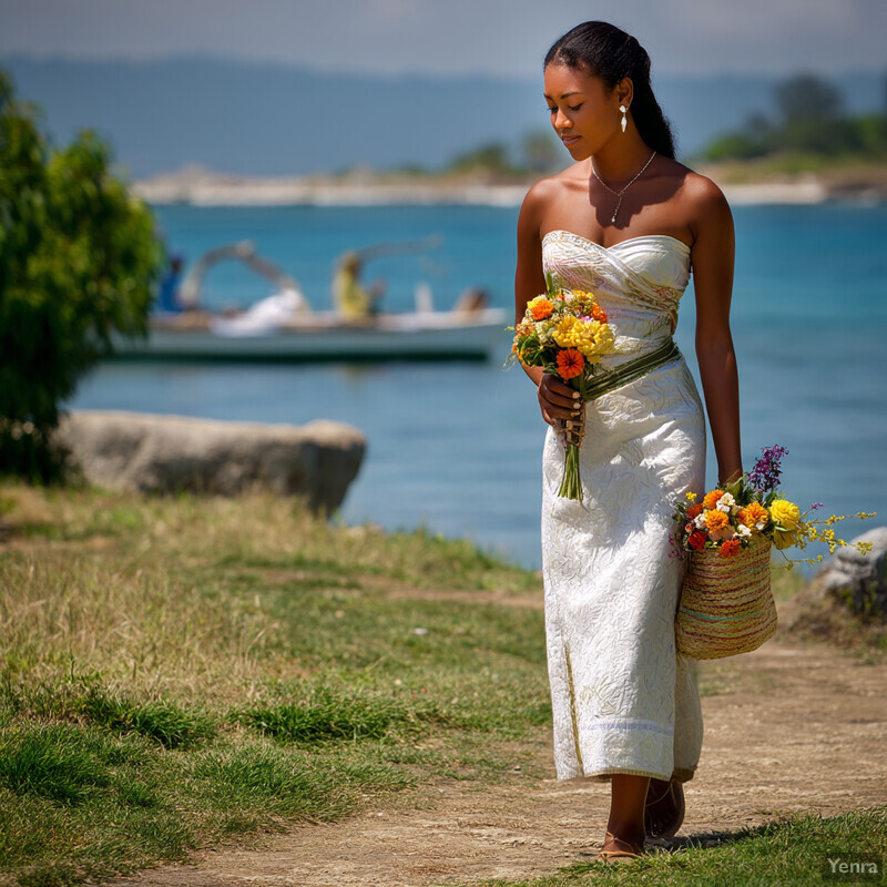 Island Bride 0 - Fiji Image Index | Yenra Serene Walk by the Sea: The photograph depicts a woman in a white dress walking along a grassy path that leads to a body of water. She carries a bouquet of flowers and a woven basket, suggesting she may be attending or participating in an event related to the sea, such as a wedding or blessing ceremony. The background features a blurred image of a boat on the water with multiple people on board, possibly engaged in fishing activities, while others are gathered on the shore, creating a lively atmosphere that complements the subject's serene walk along the grassy path.