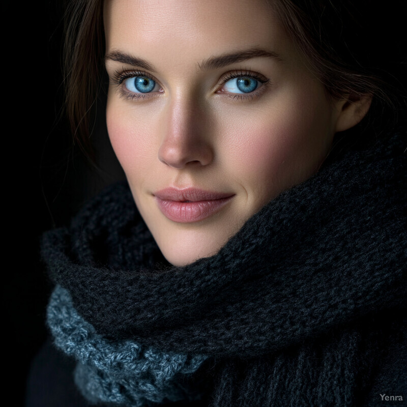 Quiet Radiance 1 - Finland Image Index | Yenra A Poised Portrayal: Close-Up of a Serene Woman with Blue Eyes and Brown Hair: A close-up photograph of a fair-skinned woman with blue eyes and brown hair, wearing a gray scarf. The photo is cropped to focus on her face, from just above her eyebrows to just below her chin, against an out-of-focus black background. She has thin, neatly-groomed brows and wears light makeup. The image highlights the subject's striking features: large, deep blue eyes with prominent white around them; full pink lips, slightly parted; and a smattering of peach-colored blush on her cheeks, subtly accentuating her natural complexion. The overall impression is one of serenity and poise.