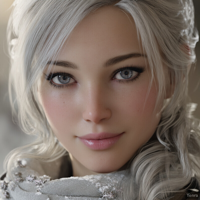 Winter Rose 3 - Finland Image Index | Yenra Serene Reflections: A Portrait of Contemplation: A close-up portrait of a young woman with striking blue eyes and platinum blonde hair, showcasing her delicate features and captivating gaze. Her makeup is subtle yet effective, accentuating her natural beauty without overpowering it. The overall impression conveyed by this photograph is one of serenity and introspection, as if the subject is lost in thought or contemplation.