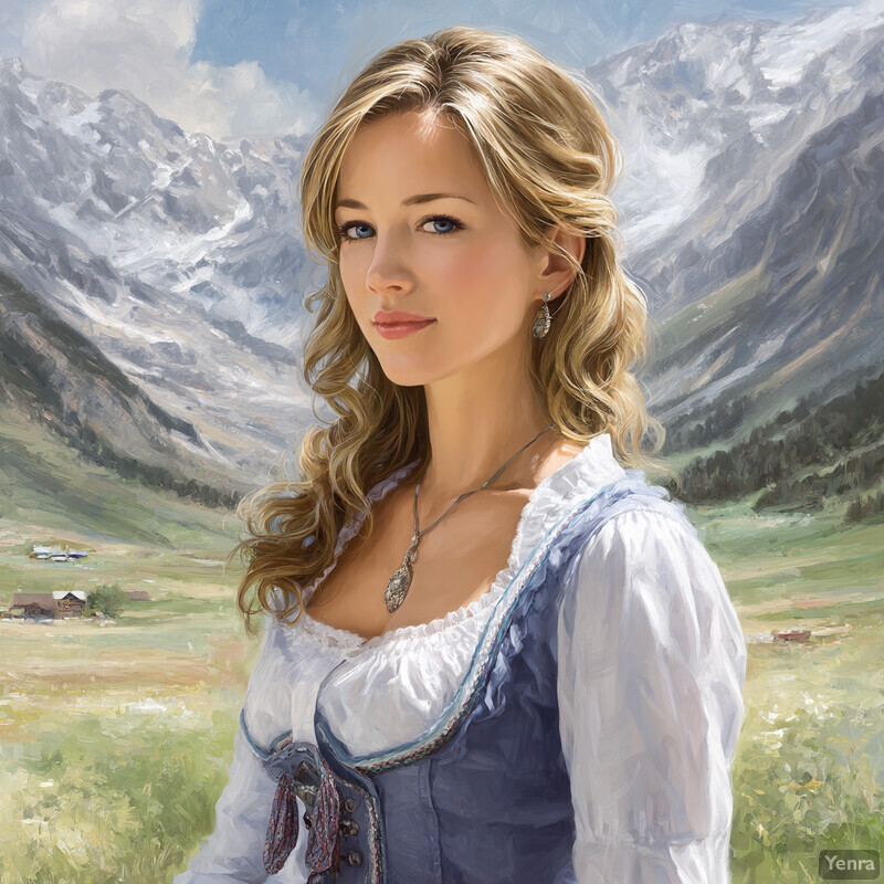 Alpine Grace 0 - Germany Image Index | Yenra A Young Woman in Bavaria: The painting depicts a young woman with blonde hair in an outdoor setting with mountains visible in the background. The woman has blue eyes and fair skin, and she is dressed in what appears to be traditional Bavarian clothing. She wears a white blouse with a low neckline, and a blue corset with a brooch in the center. Over the corset, she wears a long, white skirt. Her hair is styled in loose waves that fall down her back. The woman is standing in front of a mountain range, which rises up into the sky behind her. The mountains are covered in snow and have rocky peaks. In the foreground, there is a field of grass with a few trees scattered throughout. To the left of the image, there is a small village or town nestled among the mountains. There are several buildings visible, including what appears to be a church or chapel. The sky above is blue and cloudy, adding depth and texture to the painting. Overall, the woman stands out as the central figure in the composition, drawing the viewer's eye toward her. Her facial expression suggests a sense of calmness and serenity, which contrasts with the dramatic backdrop of the mountains and village.