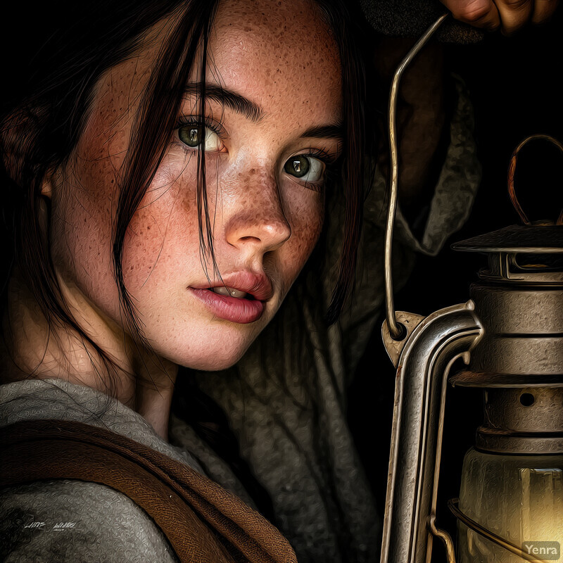 Lava Cave Light 3 - Iceland Image Index | Yenra A Moment of Contemplation: A woman with fair skin and long brown hair, adorned with freckles on her cheeks and nose. Her eyes are cast downward, gazing at an object in front of her. She is dressed in a gray top featuring a darker gray floral pattern, complemented by a brown leather strap or belt draped over her right shoulder. The woman's attention is focused on a lantern situated to her right, its metal handle grasped firmly between two fingers. The warm glow emanating from the lantern illuminates her face, creating an intimate atmosphere that suggests she may be in a state of contemplation or introspection.