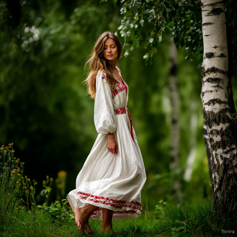 Forest Grace 0 - Latvia Image Index | Yenra Serene Forest Moment: In this serene outdoor setting, a young woman with long brown hair stands barefoot in a lush forest clearing. She wears a flowing white dress adorned with intricate red embroidery along the neckline and hem, which complements her fair skin. Her right foot is lifted off the ground, as if poised to take a step forward or turn around. The surrounding foliage appears dense and vibrant green, punctuated by hints of yellow wildflowers peeking through the underbrush. A slender white birch tree stands tall on the left side of the image, its bark gleaming in the dappled sunlight filtering through the canopy above. In the background, a blur of verdant trees stretches out, with occasional glimpses of light filtering through the leaves, creating an atmosphere of tranquility and connection to nature.