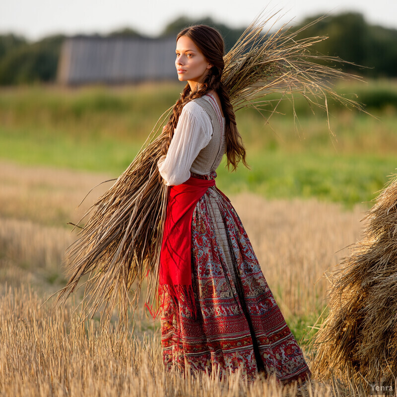 Harvest Maiden 2 - Latvia Image Index | Yenra Harvest Time: A woman standing in a field of wheat, carrying a sheaf of wheat on her shoulder. She is dressed in traditional attire, wearing a white blouse with long sleeves and a red skirt with a floral pattern. Her hair is braided and tied at the back of her head, and she has a small basket slung over her arm. In the background, there are rolling hills and trees, with the sun setting behind them, casting a warm glow over the scene. The overall atmosphere suggests a sense of tranquility and connection to nature.
