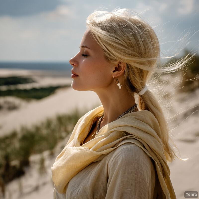 Wind in the Dunes 0 - Latvia Image Index | Yenra Serene Beachside Reflections: A woman standing in profile, facing left with her head slightly tilted down and eyes closed. She has fair skin and long blonde hair tied into a ponytail that flows behind her, partially obscuring her right ear. Her straight blonde locks cascade down the back of her beige tunic, which is adorned with a delicate pale yellow scarf draped across the neckline in a loose crisscross pattern. The scarf's edges are slightly frayed, adding a touch of elegance to the overall ensemble. A gold chain necklace peeks out from beneath the scarf, and dangling white pearl earrings hang elegantly from her lobes. Her arms are relaxed by her sides, with one hand partially obscured as it hangs at her hip. In the background, an expansive sandy beach stretches out under a brilliant blue sky dotted with puffy white clouds, creating a serene and idyllic atmosphere.