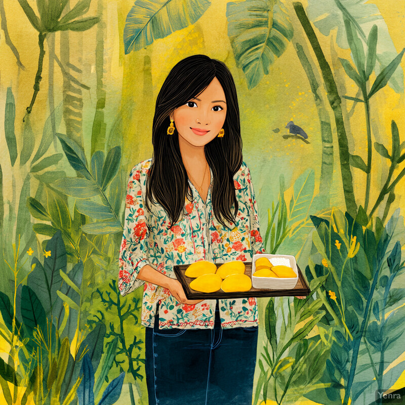 Mango Gold 0 - Thailand Image Index | Yenra A Tropical Ode to Mangoes: A painting of a woman holding a tray of mangoes in front of a backdrop of tropical foliage and flowers. The woman has long dark hair, brown eyes, and is dressed in a white floral top with pink and yellow flowers and blue jeans. She is wearing gold earrings shaped like circles and has a subtle smile on her face as she holds the wooden tray with both hands. The mangoes are arranged neatly on the tray, their bright yellow color standing out against the more muted tones of the surrounding foliage. The background of the image is dominated by lush green leaves and flowers, which appear to be hand-painted in a loose, expressive style. In the distance, there are hints of other tropical plants and trees, adding depth and texture to the composition. The overall effect is one of serenity and tranquility, evoking feelings of being transported to a warm and idyllic location. The use of color in the image is striking, with the woman's floral top providing a pop of bright pink and yellow against the more subdued tones of the foliage. The gold earrings add a touch of luxury and sophistication, while the mangoes on the tray are a vibrant yellow that catches the eye. Overall, the painting is a beautiful celebration of tropical beauty and the joy of fresh fruit.