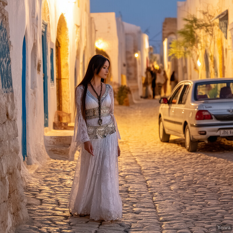 Island of Djerba Elegance 1 - Tunisia Image Index | Yenra A Serene Alleyway Moment: A woman standing in an alleyway at dusk or dawn. She is dressed in traditional attire, wearing a long white dress with intricate silver embroidery around her chest and waist, complemented by sheer sleeves that reach down to her wrists. Her dark hair cascades down her back, partially concealing the front of her outfit. The setting appears to be a small alleyway or passageway, with stone walls adorned with arched windows and doors on either side. A gray car is parked in the background, adding a touch of modernity to the otherwise traditional atmosphere. The scene exudes a sense of tranquility and peace, as if time has stood still in this quaint alleyway.
