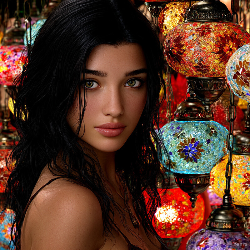 Mystic Bazaar 3 - Turkey Image Index | Yenra Romantic Evening Ambiance: A woman with long, dark hair standing in front of an array of colorful lanterns and lights. Her hair is styled straight down her back, framing her face as she looks directly at the camera with a neutral expression. The woman appears to be wearing a black or dark-colored top that exposes one shoulder, but it's difficult to make out any further details due to the image being slightly pixelated. In the background, there are numerous lanterns and lights hanging from above, each emitting a soft glow that casts a warm ambiance over the entire scene. The overall atmosphere suggests a romantic evening setting, possibly at an outdoor festival or event where people can enjoy music and food while admiring the beautiful lighting displays.
