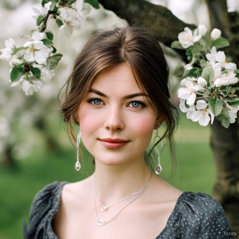Springtime Elegy 1 - Ukraine Image Index | Yenra Serene Contemplation: A young woman standing in front of a tree with white flowers, exuding an atmosphere of serenity and contentment. The woman's fair skin and brown hair are complemented by her gray dress, which features puffy sleeves and a square neckline. Her gaze is directed towards the camera, her expression neutral. She wears dangling earrings that resemble water droplets, adding a touch of elegance to her overall appearance. In the background, several branches with white flowers create a sense of depth and tranquility. The woman's posture suggests she is comfortable in this environment, possibly enjoying nature or contemplating something meaningful.