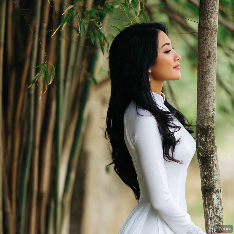 Ao Dai Grace 0 - Vietnam Image Index | Yenra Elegance in the Outdoors: A woman standing in front of a tree, with her body facing to the left and her head turned slightly towards the camera. Her long dark hair is styled in loose waves and cascades down her back. She wears a white dress that falls just above her knees, accentuating her slender figure. The dress has a high neckline and a fitted bodice, which complements her curves. Her hands are not visible in the image, but it appears as though she may be holding onto the tree or leaning against it for support. The overall effect is one of elegance and poise, with the woman exuding confidence and sophistication as she stands amidst the lush greenery.