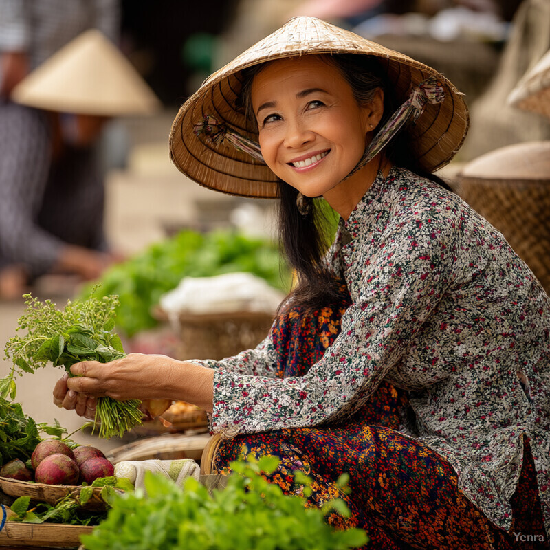 Market Smile 2 - Vietnam Image Index | Yenra Vibrant Outdoor Market Scene: In this vibrant outdoor setting, a woman is engaged in selling fresh produce from her stall, possibly at a local market or bazaar. Her attire consists of traditional Vietnamese conical hat and a floral-patterned long-sleeved shirt, exuding a sense of cultural heritage. She sits behind a table laden with an assortment of colorful vegetables, including vibrant red radishes, green leafy greens, and what appears to be ginger root. With one hand, she carefully selects a bundle of fresh herbs, adding a touch of elegance to the scene. The overall atmosphere is lively and bustling, suggesting that this is a popular destination for locals seeking fresh produce and other essentials.