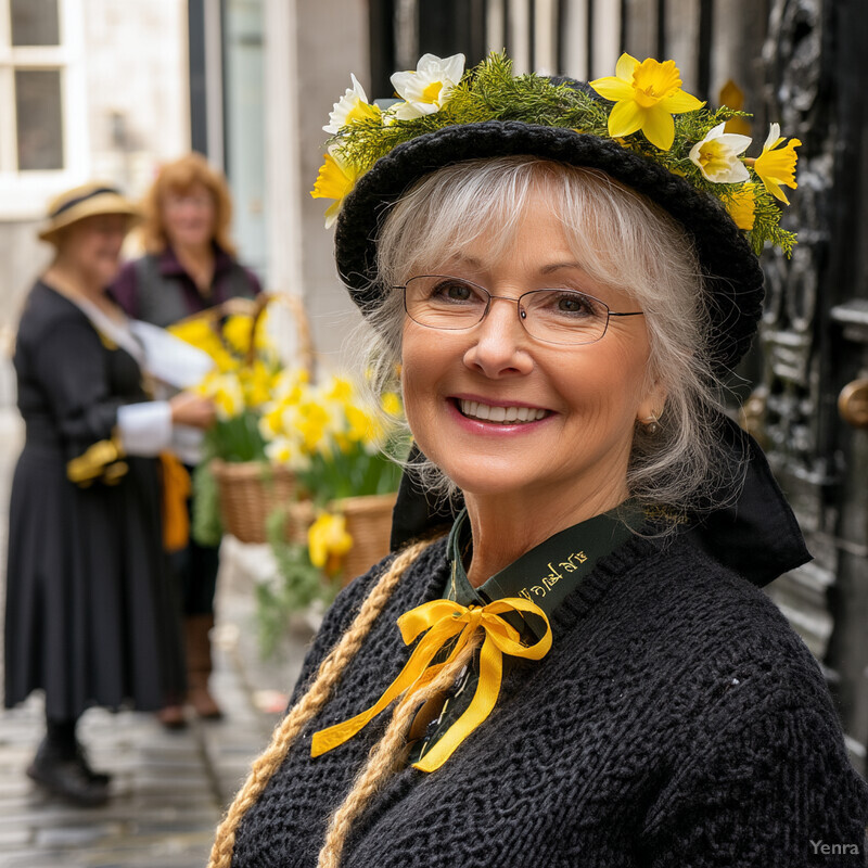 St David Day Smile 1 - Wales Image Index | Yenra Celebration of Daffodils and Spring: A woman with gray hair wearing a black hat adorned with daffodils and greenery, standing in front of a blurred background that appears to be an urban setting. The woman is dressed in a black sweater and has a long, braided blonde hair extension over her right shoulder. She wears glasses and smiles at the camera. Behind her, two women are seen holding baskets of yellow flowers and wearing similar hats. The scene suggests that they might be participating in a celebration or event, possibly related to the daffodils or spring season. The overall atmosphere is lively and festive, with the bright colors and happy expressions contributing to the sense of joy and community.