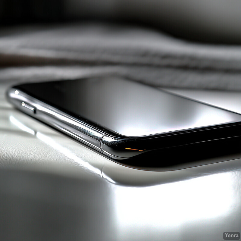 Radiant Reflection 3 - Image Index | Yenra Sleek Smartphone on White Surface: A sleek smartphone with a dark gray screen and silver frame, positioned at an angle on a white surface that resembles leather or vinyl. The phone's corners are slightly rounded, giving it a smooth, modern appearance. A small, thin strip of metal runs along the edge of the device between the screen and the frame, adding to its sophisticated look. The overall design of the phone suggests that it is a high-end model, possibly from a well-known brand such as Apple or Samsung. The lighting in the image highlights the curves and lines of the phone's casing, creating a sense of depth and dimensionality.